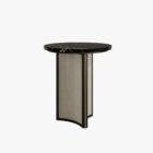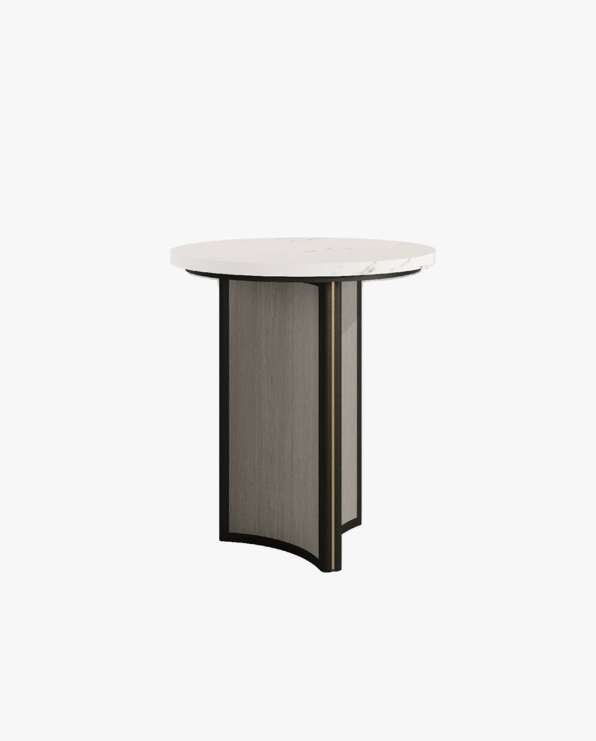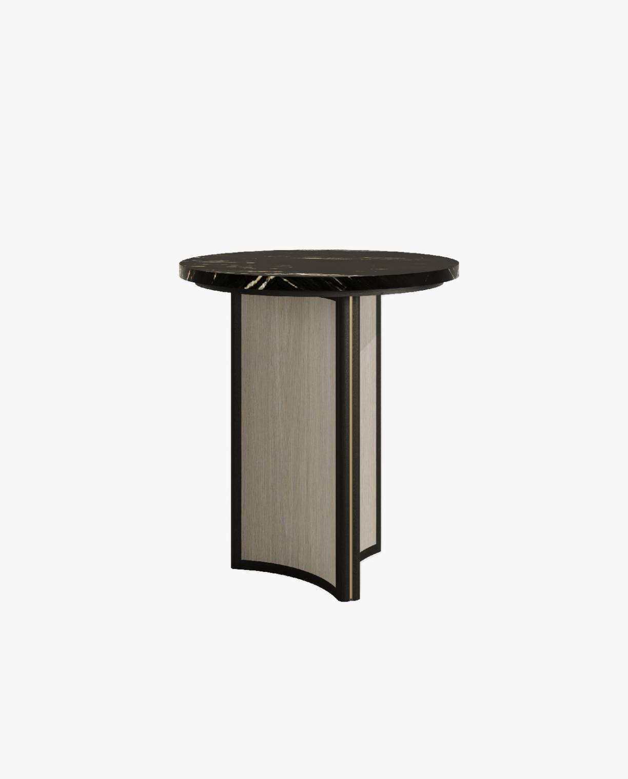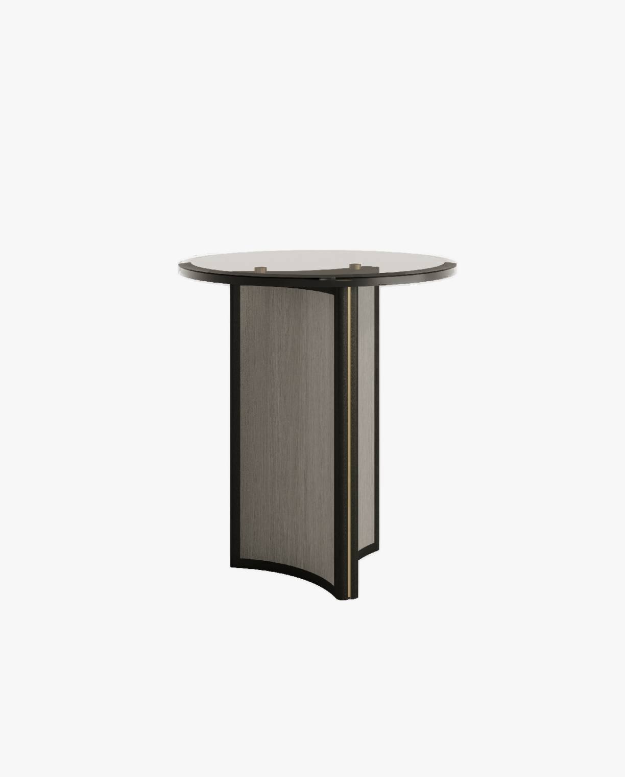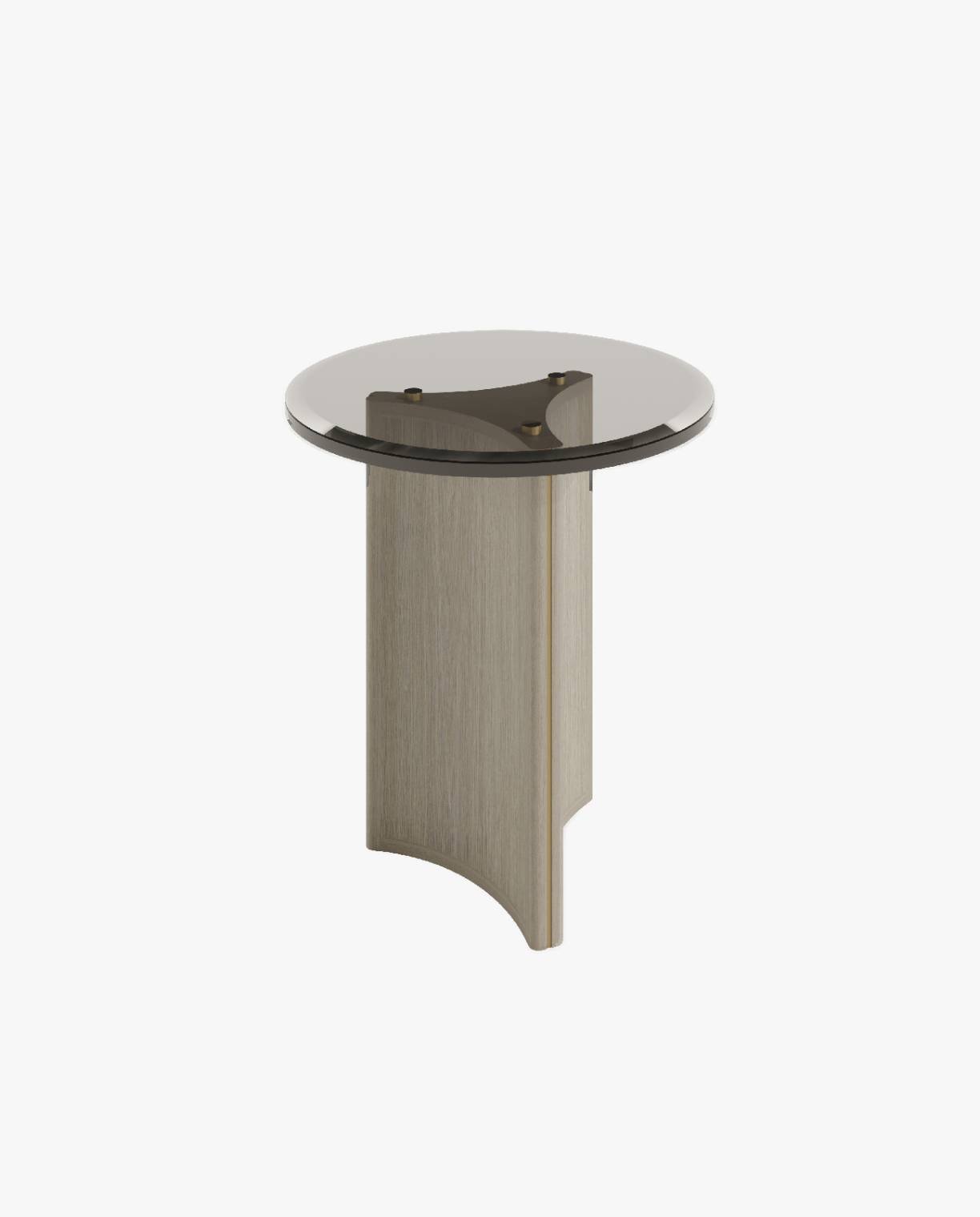 The Aura side table enhances the living room with style and elegance. The versatile table features an exquisite leg and is made of wood veneer, with details in solid wood and antique brass. The Aura is available with three different tops: glass, natural stone, or wood.