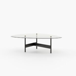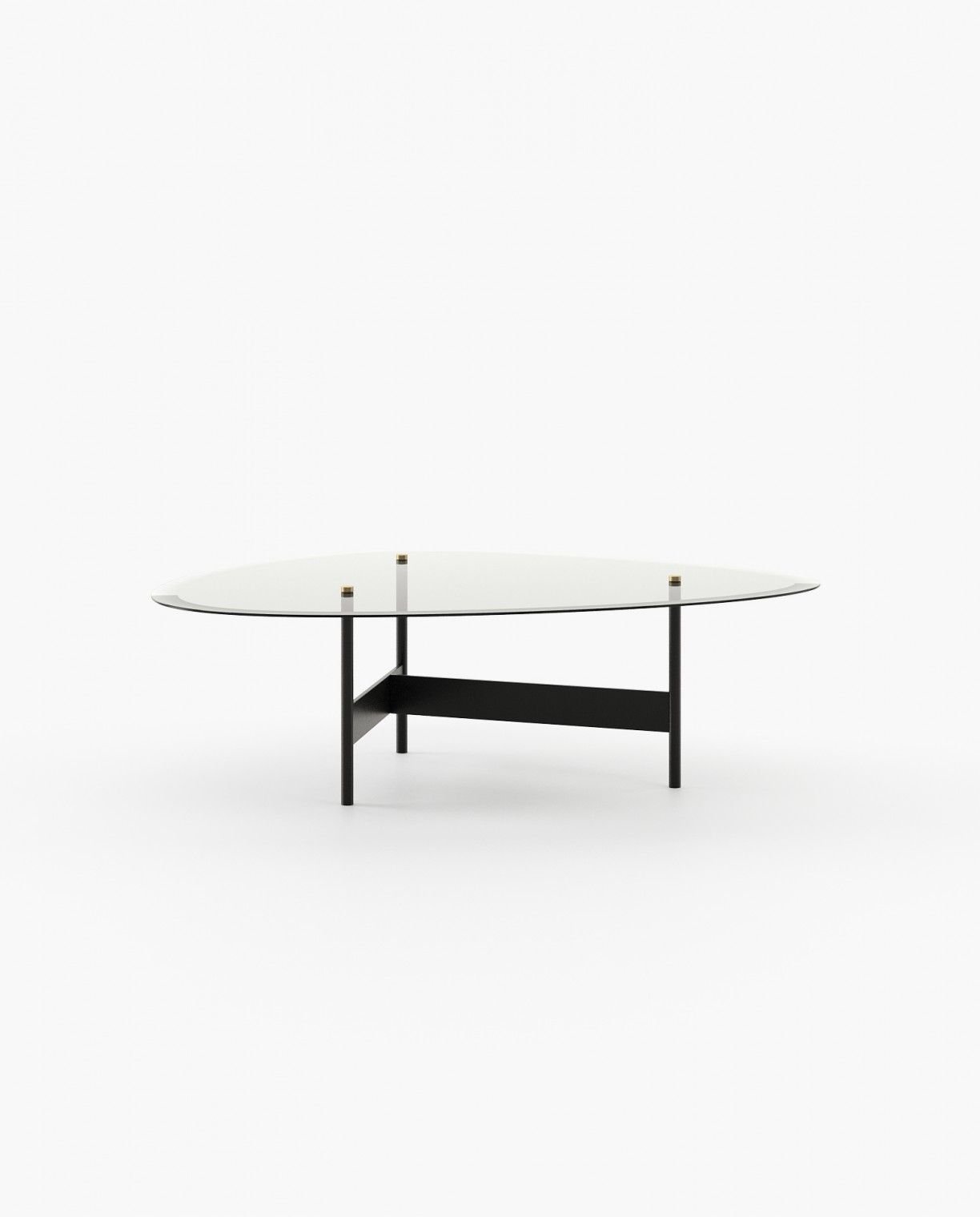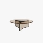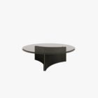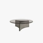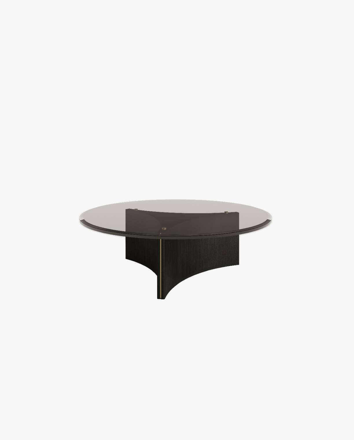 The Aura round coffee table features a graceful circular design with an optional glass or natural stone top. Its concave legs, adorned with antique brass detail, provide a sense of classic sophistication. This table easily enhances any living space with its chic aesthetic and elegance.