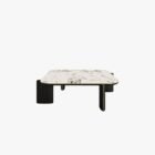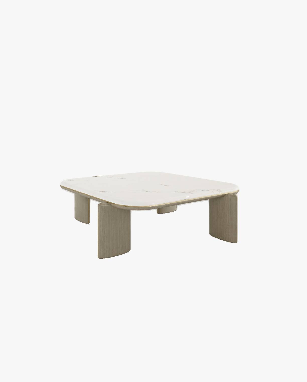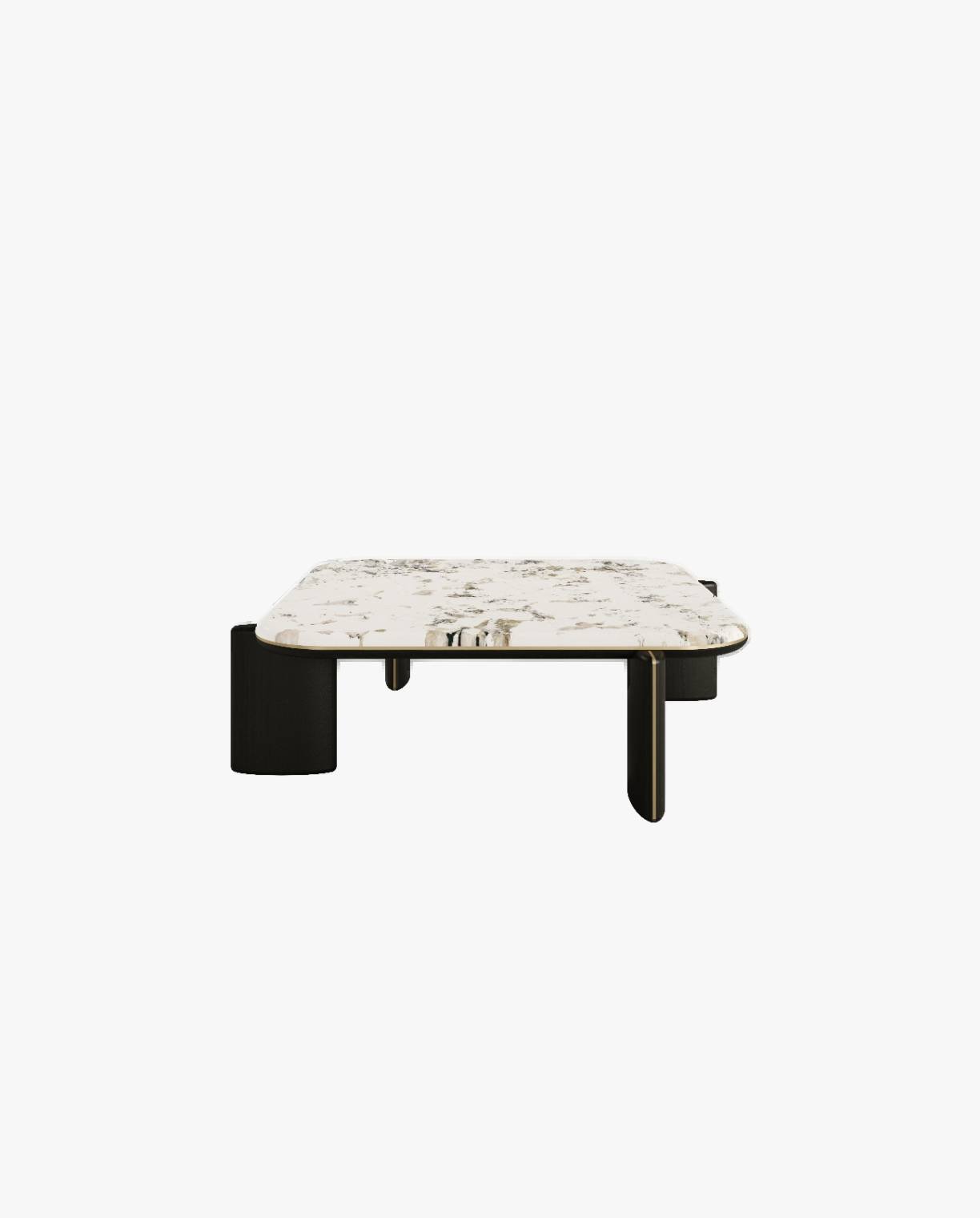 Sculptural elements, refined materials and accurate details identify Elysian coffee table. In a square or rectangular version, the elegant finish of the structure, in solid wood and antique brass details, refined cabinet-making workmanship, is combined with the natural stone top.