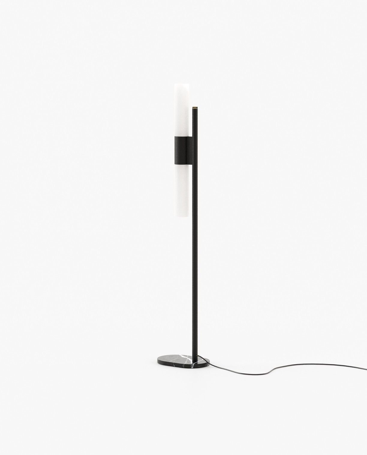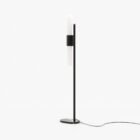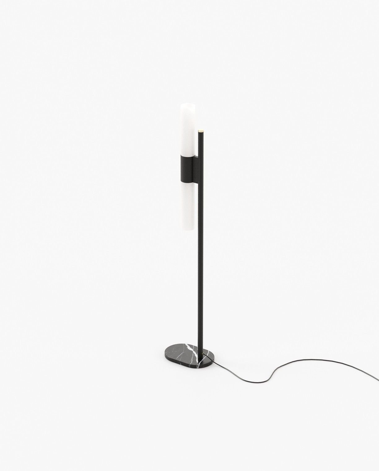 The Evans floor lamp is a minimal, stylish addition to a contemporary living room, bedroom, or hallway. It features a streamlined design with a low, marble base and an iron or steel structure, making it a great lighting addition to your design project.