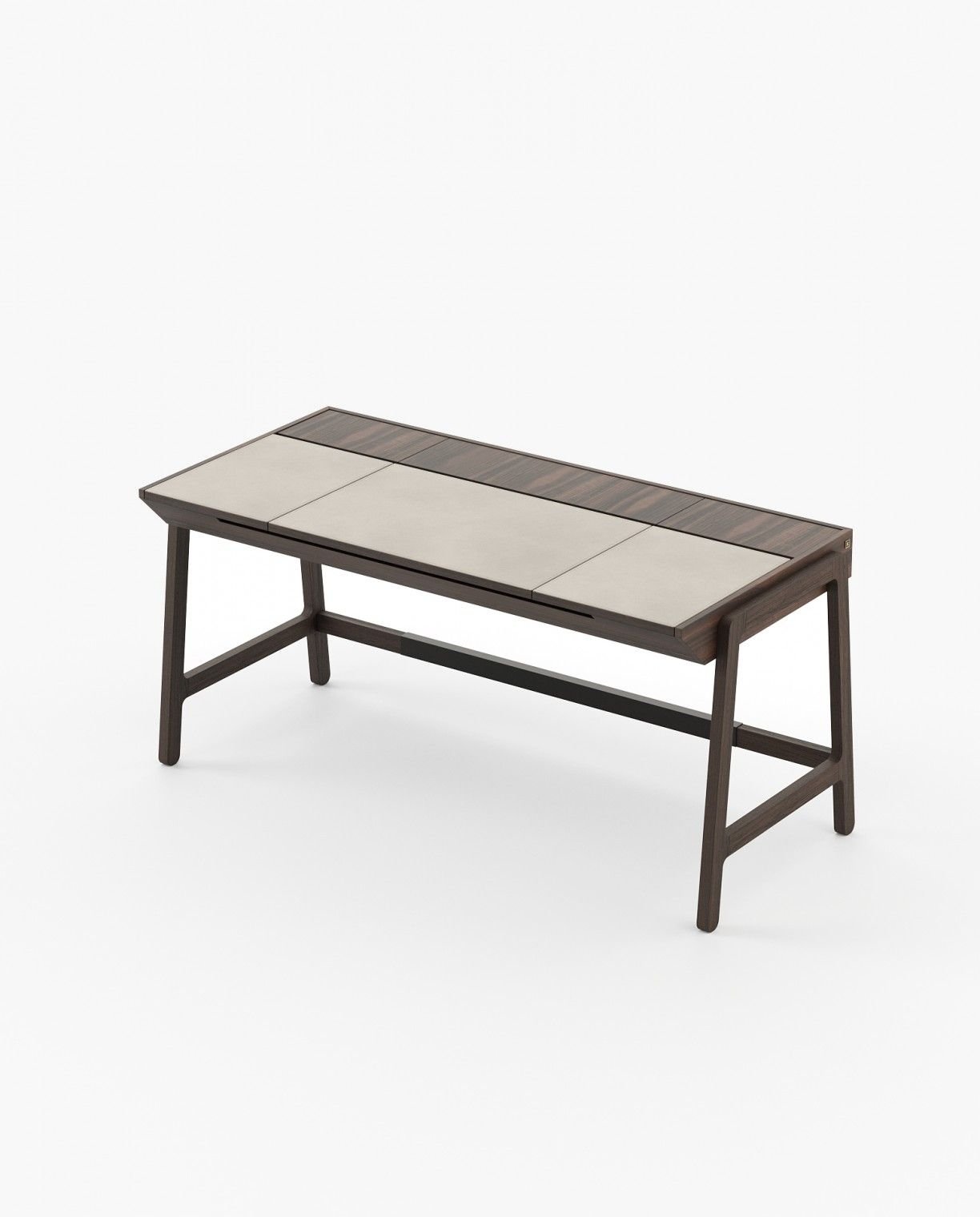 The Gatsby office desk introduces a sense of grace and purpose to the workspace. Designed with clean and simple lines, the desk top features a lift-up lid covered in Seoul or Saddle leather, adding texture and appeal to the work environment. The frame and legs are available in all the woods and finishes from the collection, as well as the interior shelves. Only the footrest is available in textured black iron.