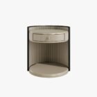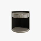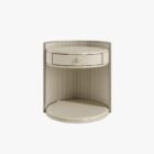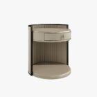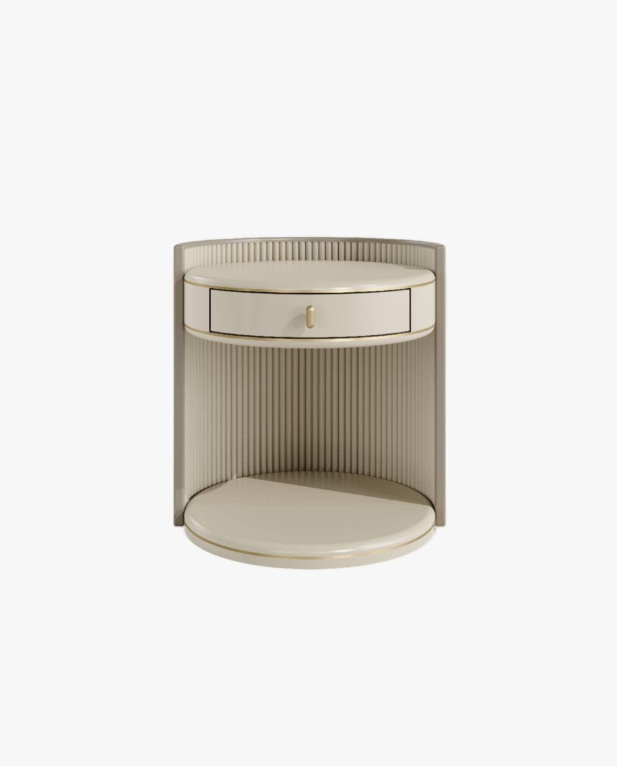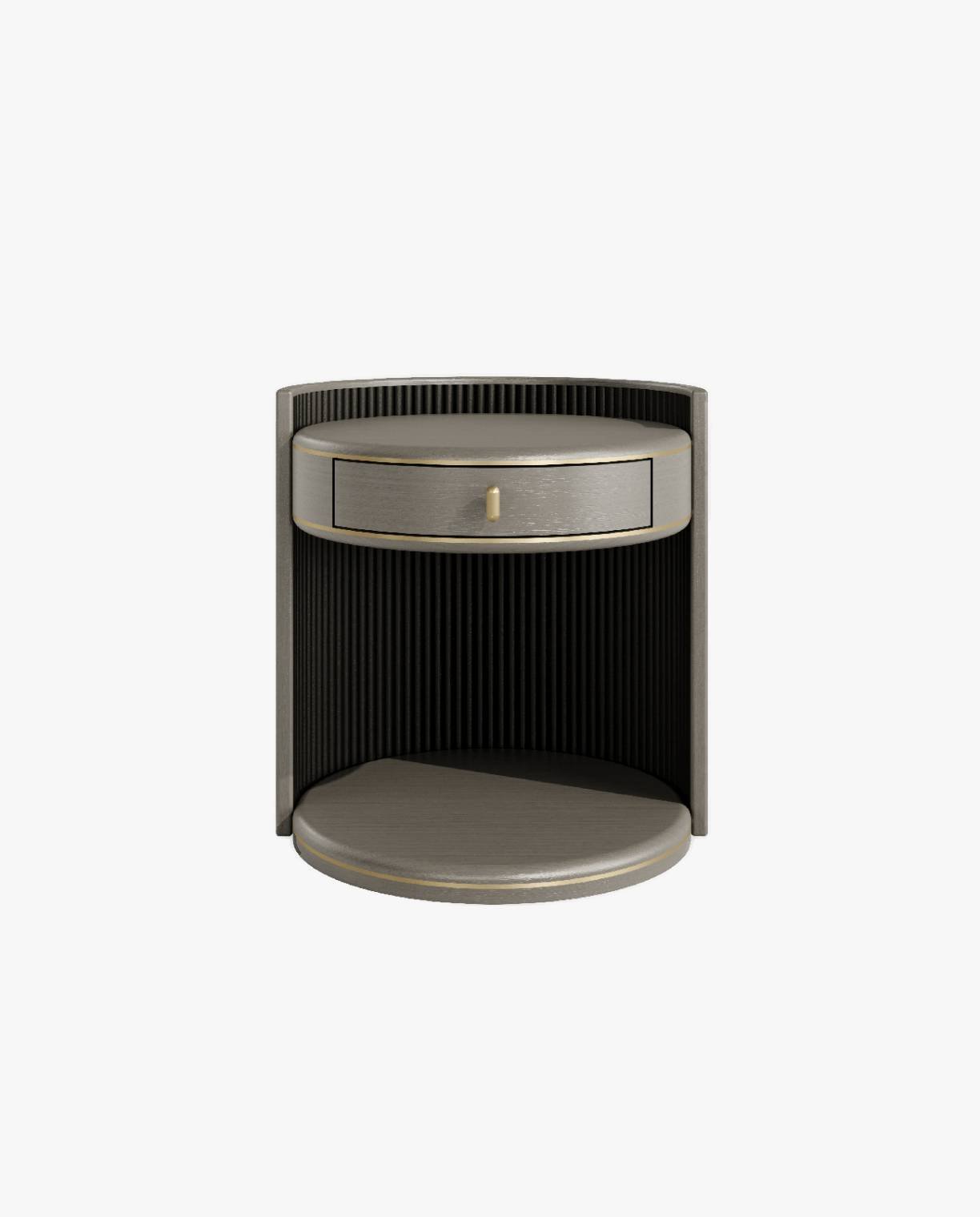 The Lumina bedside table is a perfect blend of contemporary design and elegance. Its round top and semi-circular base with a slatted interior create a unique aesthetic. Available in lacquer or wood finishes, the table is accented with antique brass details. The Lumina table effortlessly elevates the style of any bedroom with its modern yet timeless charm.
