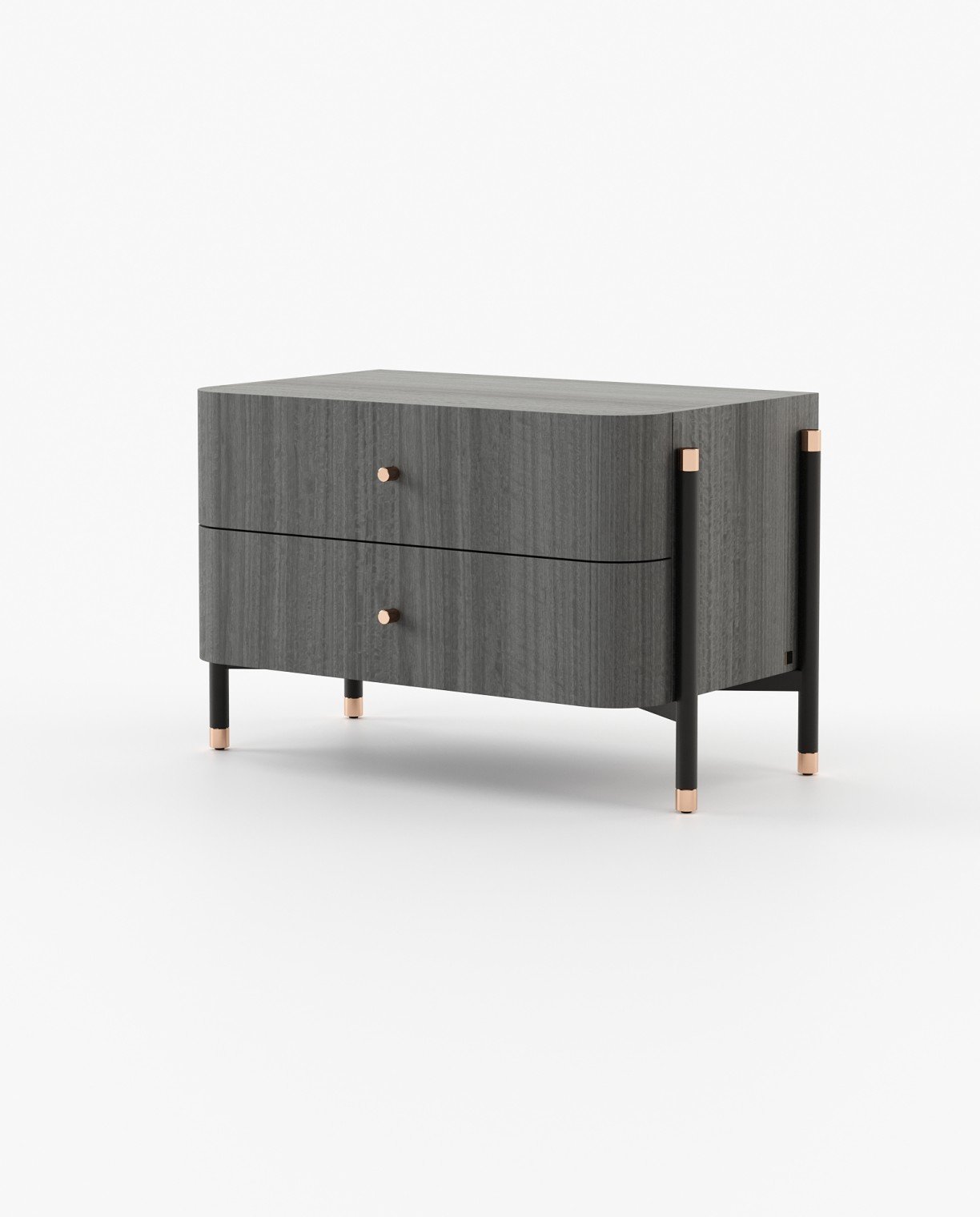 Seen as a meticulously crafted symbol of elegance, Rosie is a bedside table with drawers that will grace any bedroom with its refined presence. It has two drawers for practical storage solutions. This product is available in two standard sizes, with custom dimensions available, offering versatility to suit different space requirements.