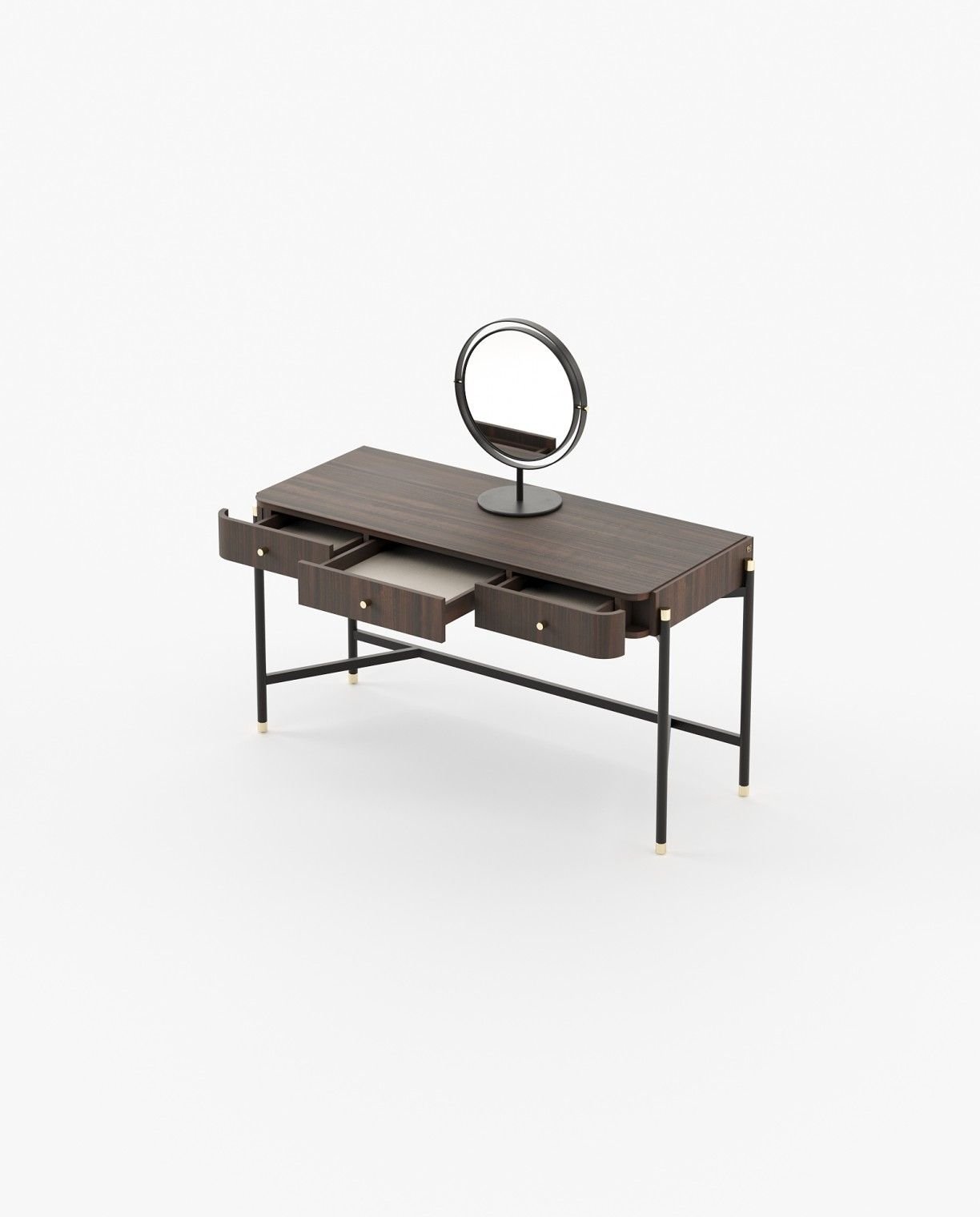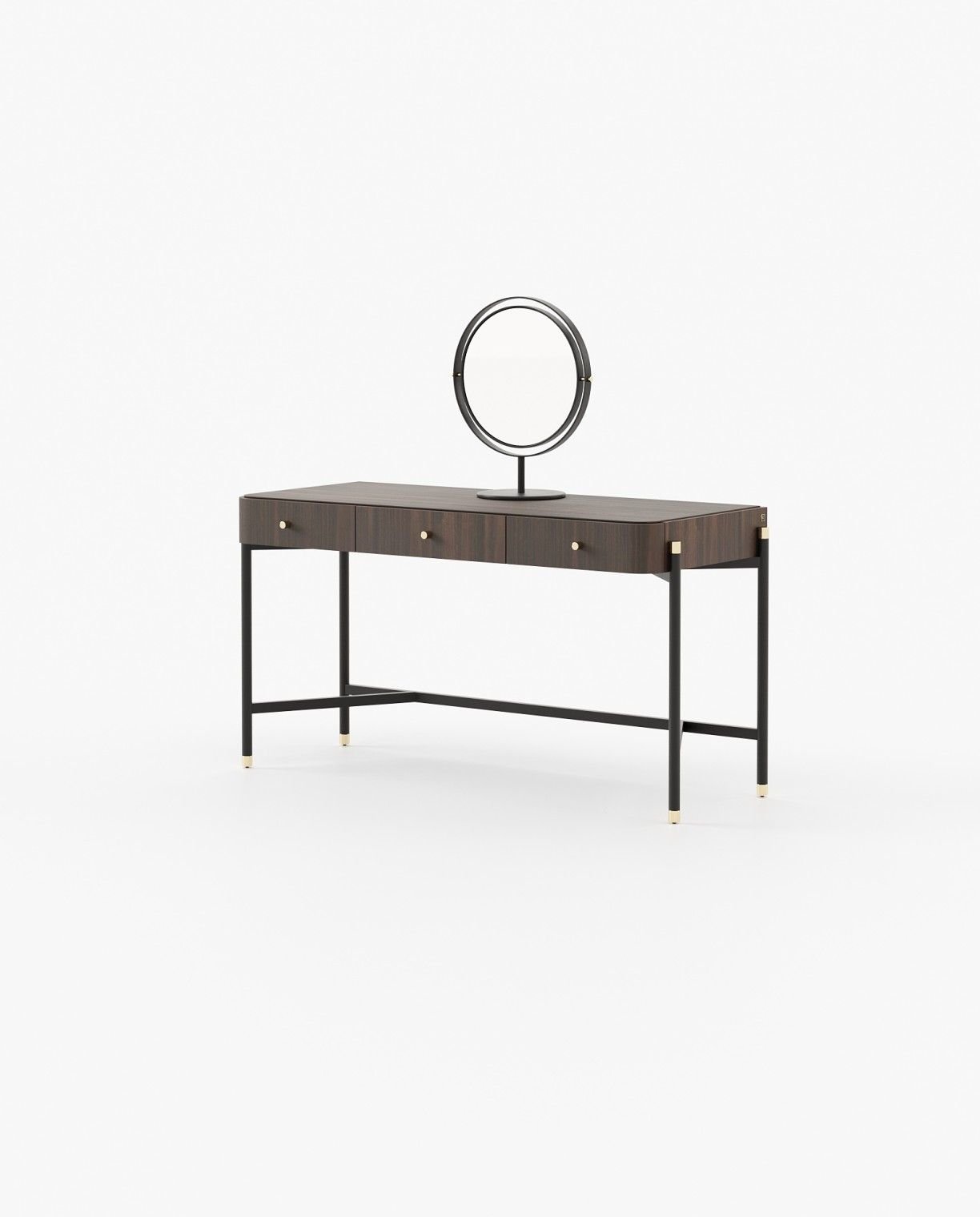 Rosie is an elegant dressing table that combines contemporary style with captivating lines. Its simple iron structure supports three drawers, while a metal-framed mirror adds a touch of glamour, making it the perfect piece for a sophisticated setting.